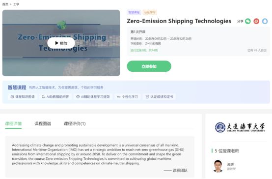 为贯彻落实国家教育数字化战略行动,促进数字技术与教育教学深度融合,推动人工智能赋能教育教学转型,提升本科课程建设质量,助力人才培养实效,学校开展了校级本科生数智课程及国际化课程立项和培育工作。在2024年试点建设10门“数智课程”基础上,2025年又正式立项建设23门智慧课程(AI-MOOC)以及8门国际化课程(I-MOOC)。《Zero-Emission Shipping Technologies》是我校智能低碳航运领域中英合作系列国际化智慧课程中首门上线的课程。